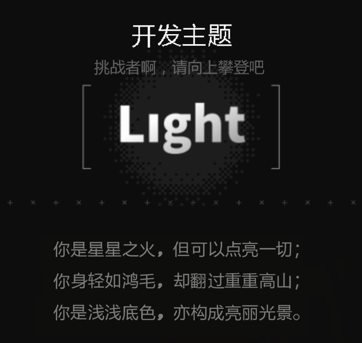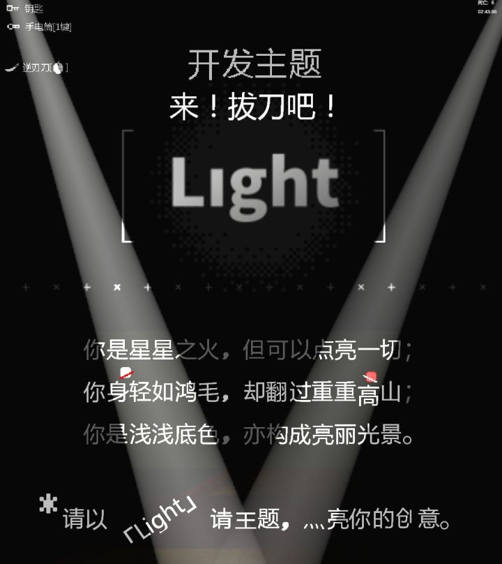 10月8号当我看到这次聚光灯 GamJam 主题:「Light」的这张图的时候,思考了大概不到10分钟,就决定就要用这张图来开发平台跳跃游戏,玩家从下往上攀灯,最终点亮灯。 我构思将谜题与文字结合起来,每层解锁玩家的一种能力,玩家通过跳跃解密,一层一层的解锁。 于是开始用第一层测试我的想法,把左侧的星号设计成可以上下浮动的电梯,可以让玩家踩踏进入上层。因为提前设计的一个隐藏的门,玩家需要踩踏