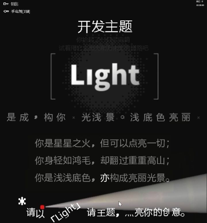 第一层的开发结束后,我开始构思第二层的设计。玩家会首先拿到一个【手电筒】,这里玩家是没办法前行的,因为字符还没有激活,玩家应该会到处乱照尝试照出来什么机关。 这里我设计了一个隐藏的路,当灯光上下连线重合时,激活一个字块,当玩家明白了这里,其他的便迎刃而解了。