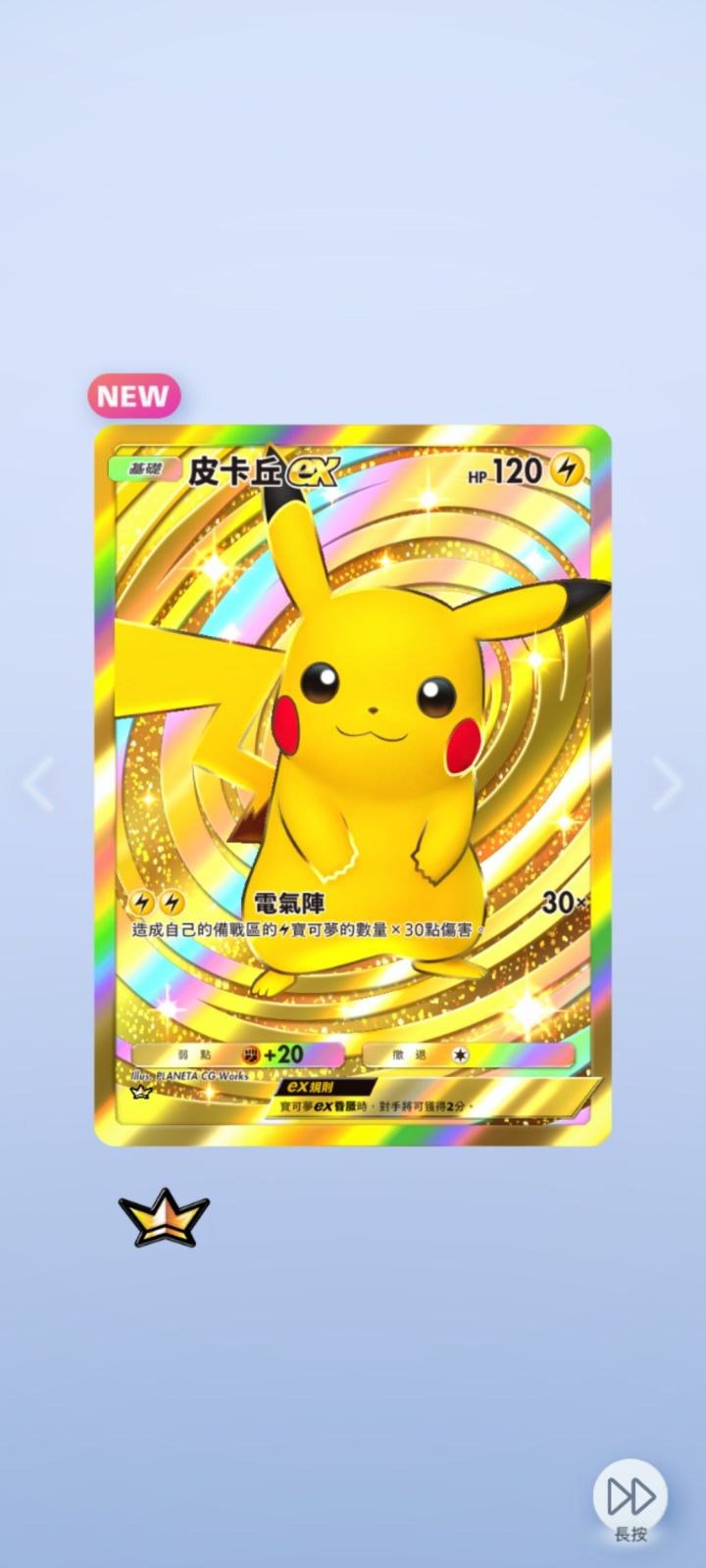 五十抽超梦,一个超梦ex都没出,拉鲁拉斯更是一张没有,然后来脾气氪金又来了十抽抽老喷,然后我出了一张皇冠皮卡丘,,,,,,,现在我迷茫了,继续抽超梦对不起老喷啊,继续抽老喷对不起皮卡丘啊,我现在还是妙蛙种子这套卡组,,,太弱了