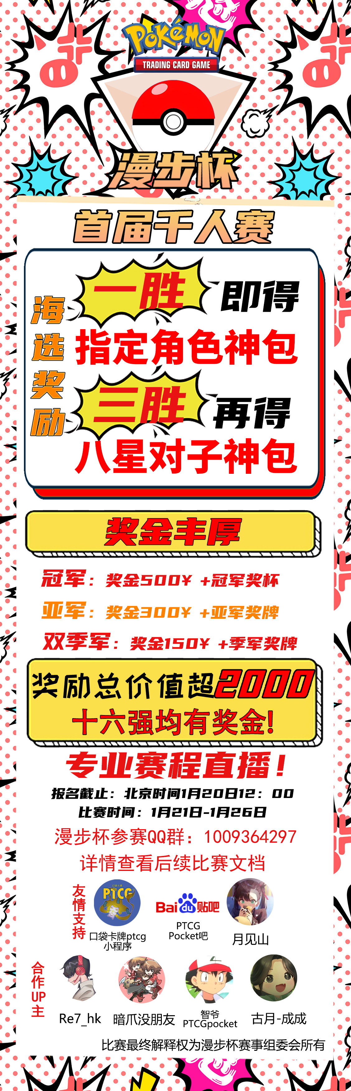 首届PTCG Pocket漫步杯千人赛开跑!报名看首图底部,比赛安排,赛制,奖金详细内容看后图!期待您的参加,并祝各位牌运亨通!#今天游戏圈发生了啥