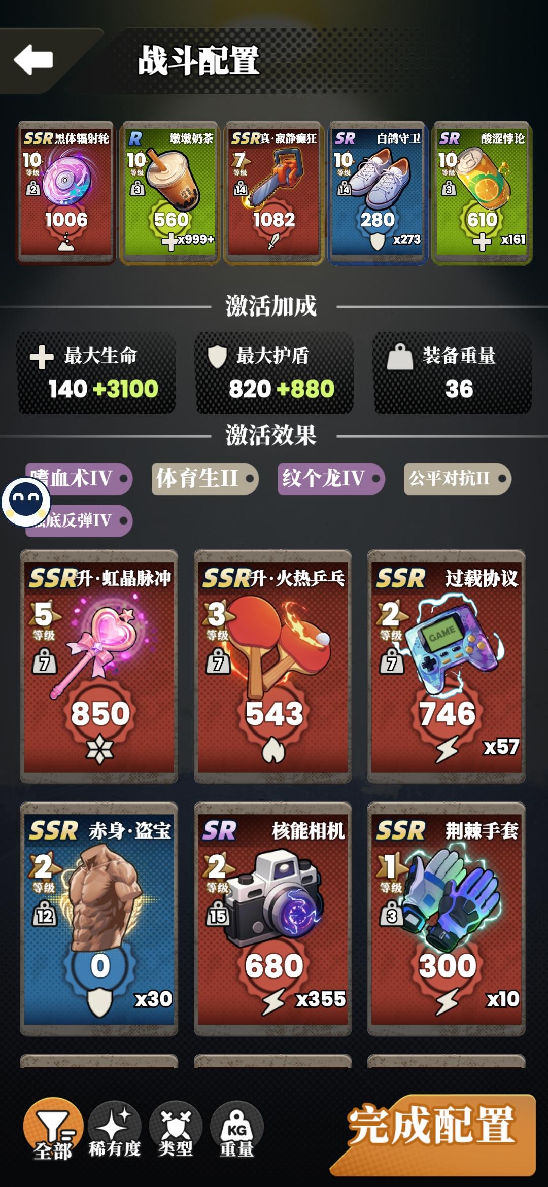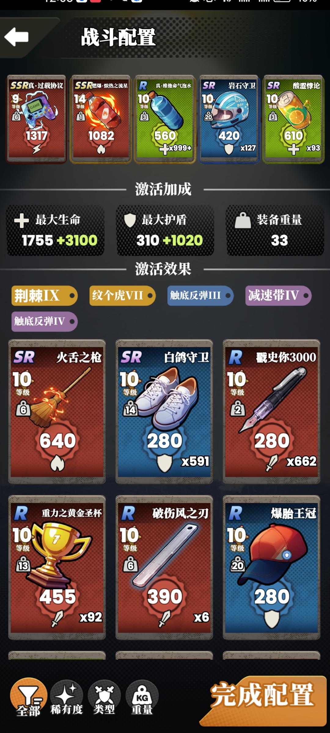 战斗系统有点无聊,从头到尾都一个样,而且并不复杂。自己摸索一会也能摸索明白,按照伤害要高,负重要低,容易抢先手和打出高伤害就行,装备有两个SSR成长类型的很重要,刷到了就优先升级他们,从开始刷到结束大约能多出一千血和一千护盾,不过注意不要带吸血的,似乎会被吸血顶掉。然后战斗时多花体力随机,没有打不过的怪,死了看广告复活。如果不想摸索,直接去社区抄一份攻略。其实战斗对武器要求不高,只要肯花体力随机,三个道具全随机到攻击类型的武器,直接伤害翻三倍,没什么一次打不死的。
