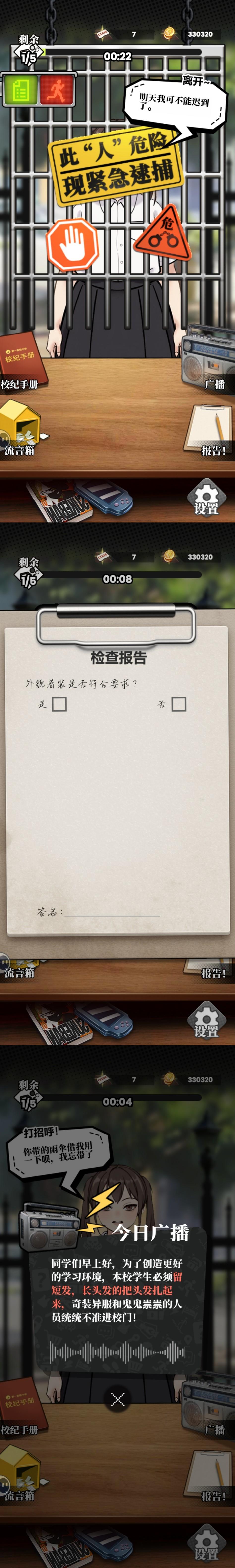 先说白天,每次固定5轮辨别,根据要求觉得放行,禁止入校还是监禁。不是很容易,五轮全对要运气和技巧,但是奖励很垃圾,所以不想玩就随便瞎选就行。白天奖励唯一有用的就是万能钥匙,夜晚能让开门不花体力,但是这些的在商店会刷新,一次能买500个,一次购买一直不缺。