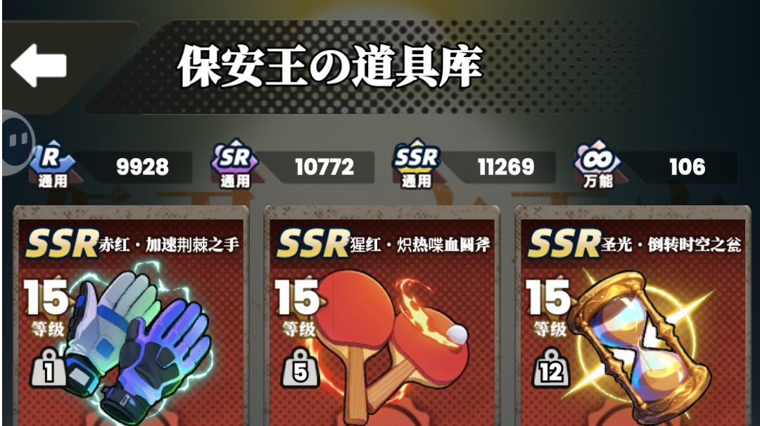 图一:前期SSR碎片不够情况下可以使用该套装 优点:速度较快,伤害高的同时也拥有续航能力,buff效果可以,同时可以由其他武器替代,例如游戏机换成魔法棒 图二:SSR武器多了起来并且碎片尚且不充足情况下使用 优点:速度最快,可以刷血量属性,伤害也不低 图三:最经典的刷三物套装 优点:可以同时刷血量,护盾属性和校牌,但是该来很看脸 缺点:速度太慢,基本上稳定吃伤害 图四:(本人在用) 优点:速度略高