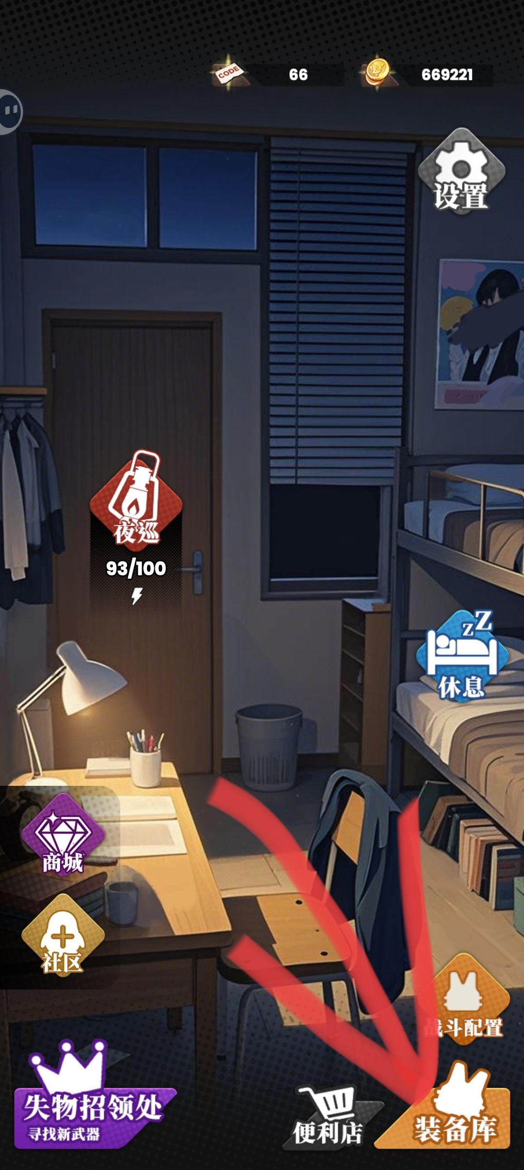点开游戏就是第一张图。打开右下角。我箭头标注的地方可以进入第二张图。点一个自己喜欢的装备。就可以开始升级了。升级的时候注意装备搭配。#发现好游戏 #游戏日常 #我的同学是伪人 #巡夜小妙招 #夜巡小妙招