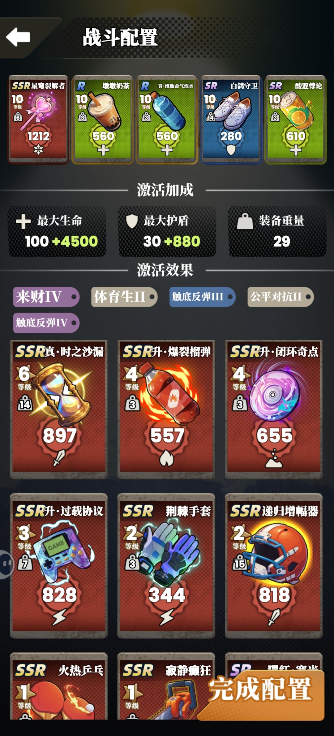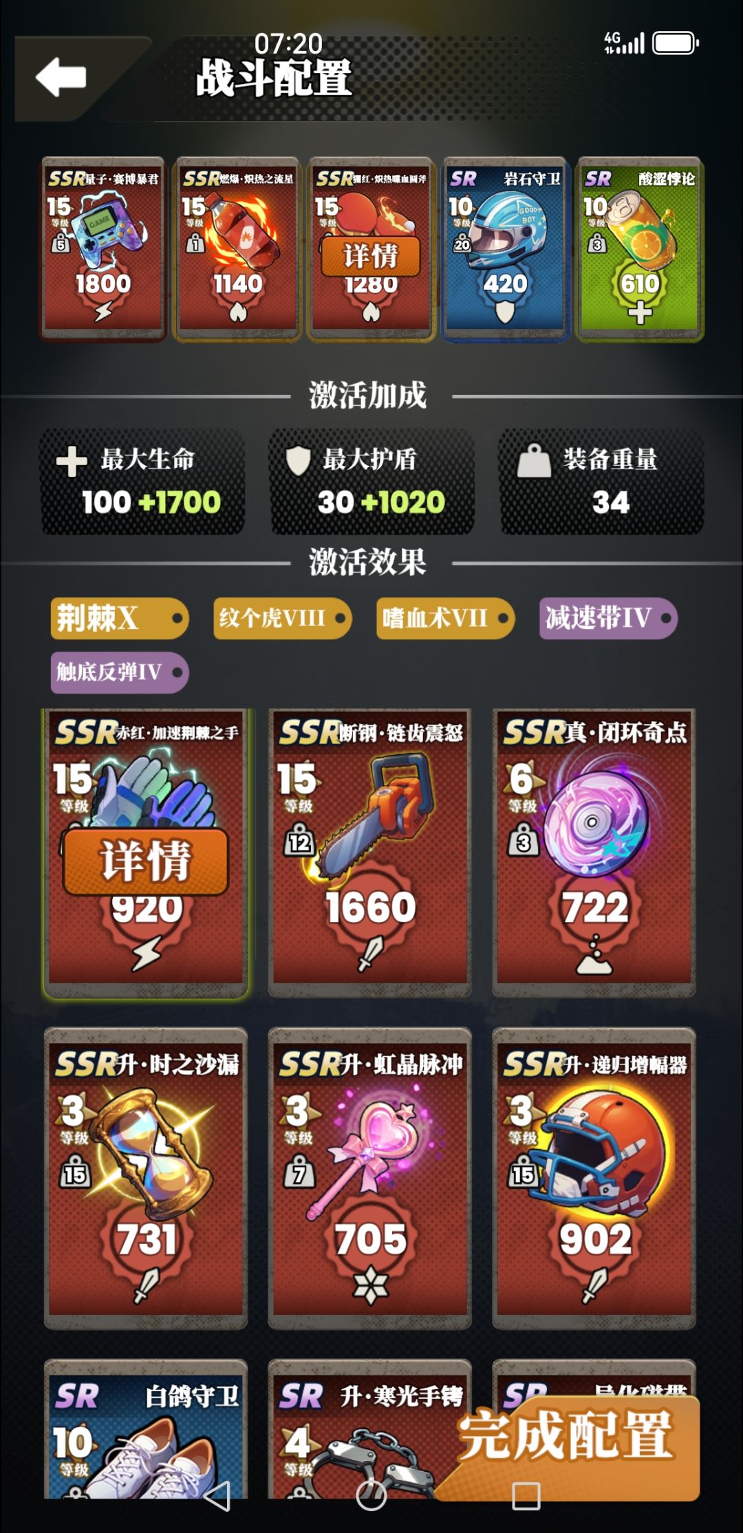 1、战斗配置:真爆裂榴弹、存档覆写者、黑体辐射轮、岩石守卫、酸涩悖论。 2、激活加成:最大生命+1700、最大护盾+1020、装备重量34。 3、激活效果如下。 4、这套卡组适合在中后期使用,可以快速压倒大量敌人,并且回血和防御能力也很优秀。 5、飞轮(吸血)和手柄(荆棘)是主要的续航输出,蓝绿卡建议在到食堂副本前升满级。 6、建议将存档覆写者(手柄)和黑体辐射轮(粉色飞轮)十级,就能靠先手秒杀对