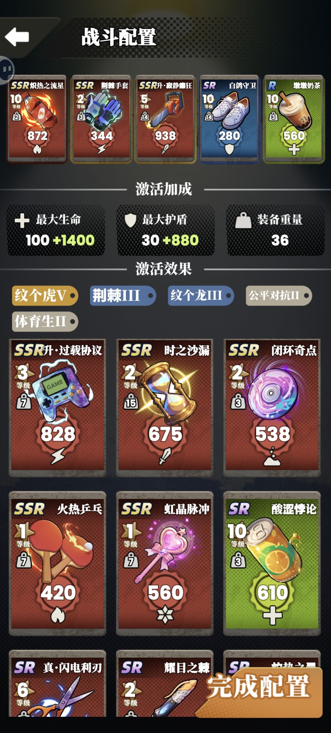 第一个伤害高,速度也尚可,又能快速回血。(轮/乒乓,吸血必备,有哪个用哪个,轮更好) (游戏机性价比很高,伤害高,负重又低,有最好) (最后一个,看属性克制,或者选一个高伤害,负重低的就可以) 第二个就是练体,刷护甲值,生命值 (纹虎,纹龙)