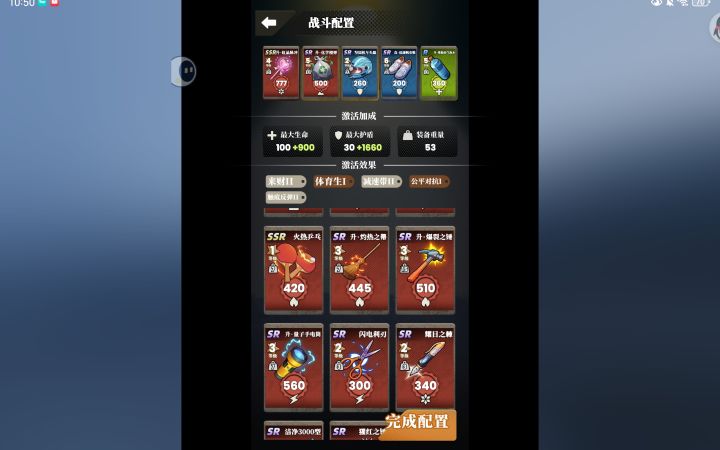 卡牌搭配分享及攻略 图一图二分享了两套 可以参考 激活效果中 纹个龙和纹个虎 概率触发 会永久增加盾和血量,前期非常建议带上这俩效果刷盾和血。 数据说明:①攻击力:就不说了②护盾和生命:刷怪时有盾先扣盾无盾扣血。③装备重量:影响攻击速度,重量越大速度越慢,有的怪速度很快,那攻击的时候就是对方先手。所以重量尽量选低的可以抢先手。④激活效果:点开可以看到详细介绍 龙虎前期必带,盾血刷够了的话,目