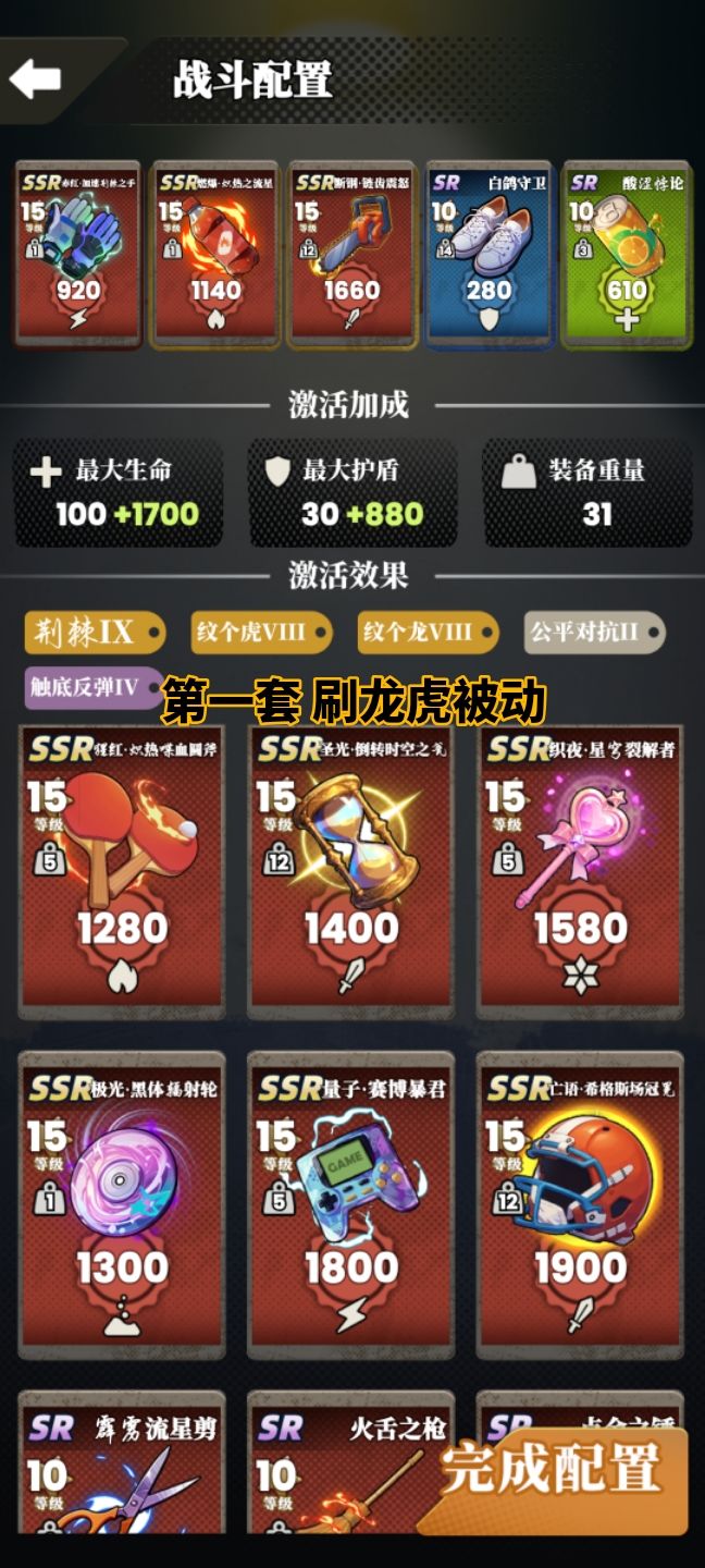 卡牌搭配分享及攻略 图一图二分享了两套 可以参考 激活效果中 纹个龙和纹个虎 概率触发 会永久增加盾和血量,前期非常建议带上这俩效果刷盾和血。 数据说明:①攻击力:就不说了②护盾和生命:刷怪时有盾先扣盾无盾扣血。③装备重量:影响攻击速度,重量越大速度越慢,有的怪速度很快,那攻击的时候就是对方先手。所以重量尽量选低的可以抢先手。④激活效果:点开可以看到详细介绍 龙虎前期必带,盾血刷够了的话,目