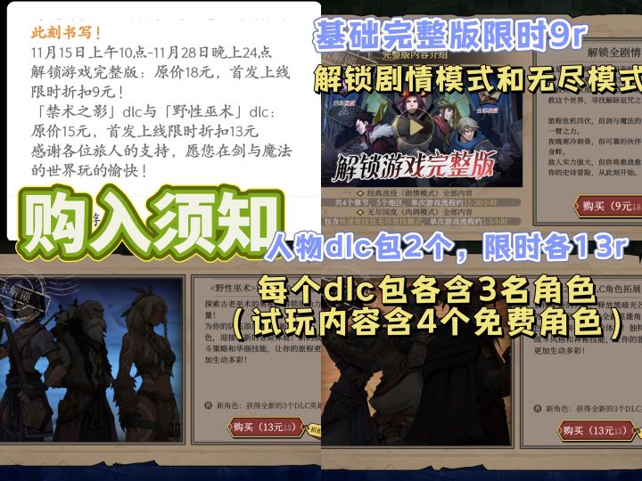 2.游戏的基础完整内容购买,限时9r,但其中仅限4名基础角色的游玩;人物dlc包各含3名额外角色,每个dlc包限时13r,也就是完整购买是35r,是否购入看个人需求~
