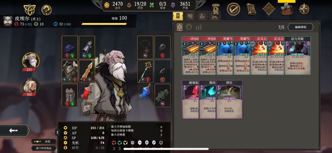 最适合新手宝宝的套路 只需要这4件装备就行 不分角色 但有个前提 需要一定的等级才行 需要把职业本身的牌都消除掉 1.消除所有的职业牌 只留下以下图片中的装备技能 2.保证智力有25点(可以点出第三阶段的智力天赋 让抽卡+1) 如果不够 可以打宝石 这个套路不需要管站位 正常的情况下 单角色就可以打通关 天赋的搭配请自行研究 因为这个套路完美成型后 游戏就变成了简单游戏
