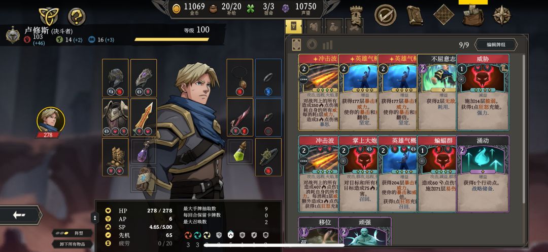 捣鼓半个月,总算玩明白了。 首图是卡组搭配,3张英雄气概,2张冲击波(精简可以只要一张。但是暴怒精炼的10级冲击波比装备自带的13级冲击波伤害还高,建议还是用精炼的。),1张掌上大炮(群攻清小怪),1张不屈意志(2回合无敌),1张威胁(鞋子自带,脆弱减益。),1张蝙蝠群(减益易伤)。 后面的图是主要装备。项链换孤狼会更合适,戒指都还没怎么弄,噩梦已经横着走了。英雄气概确实超模,操作也简单,打起来也