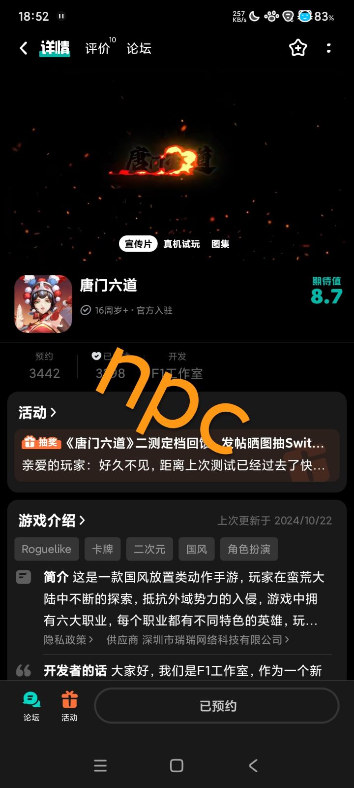 大家好,我们是F1工作室,挂机战斗轻松上阵,《唐门六道》最新资料已通过审核,现已开放预约,我们是一款架空神话世界观的竖版放置动作RPG,将于近期开启小范围玩法测试和大家见面。 游戏可通过搭配不同属性、职业古神,体验极限冲层暴爽战斗的快感,我们会定期推送展示更多游戏内容,希望大家多多关注,感谢支持~ ========参与预约,赢京东卡========预约《唐门六道》,并将预约页截图分享至本