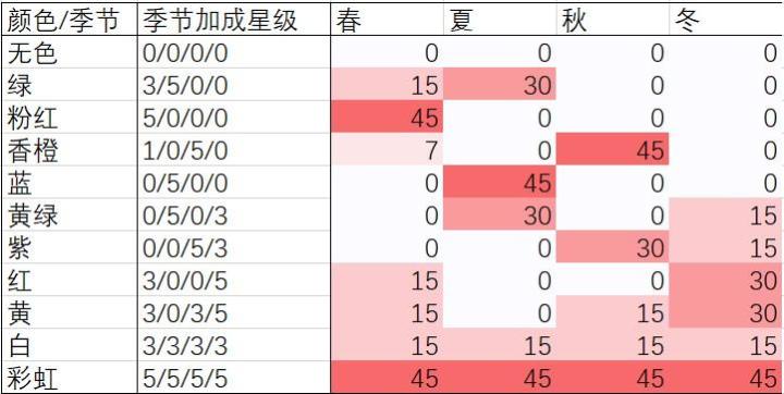 3.对应【季节加成星级】,颜色和香味的加成数值有【0、7、15、30、45】(7只出现过一次)。