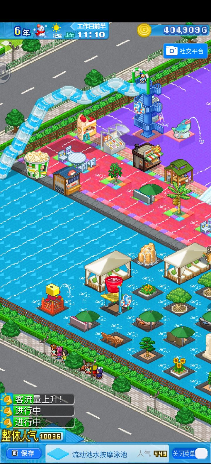 3.游戏中有超多建筑,类型分为6种,分别是:[装饰(可以对季节及人气有加成)][泳池(不同的泳池瓷砖)][功能性建筑(免费座椅可以恢复顾客的体力,付费座椅可以得到G还可以恢复顾客体力)][餐厅(最主要的赚钱场所,可以卖五个商品,商品可以自主研发,详细见食谱图)][游乐设施(可以对泳池有加成,分为气味加成和人气加成)][水上滑道(对连接的泳池有极大加成)],建筑多多益善,但是一开始不要建造太多,会破产,详细见攻略板块,建筑有几乎几十种,可以收集许多