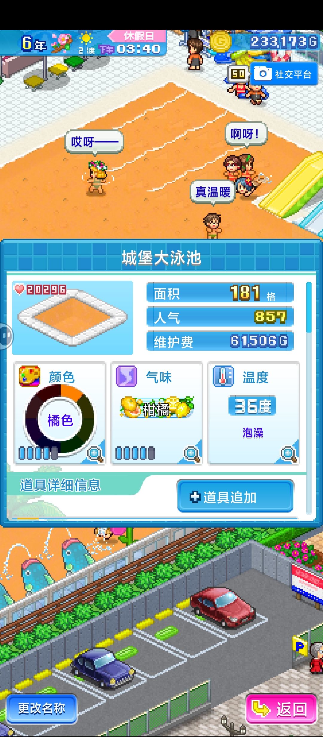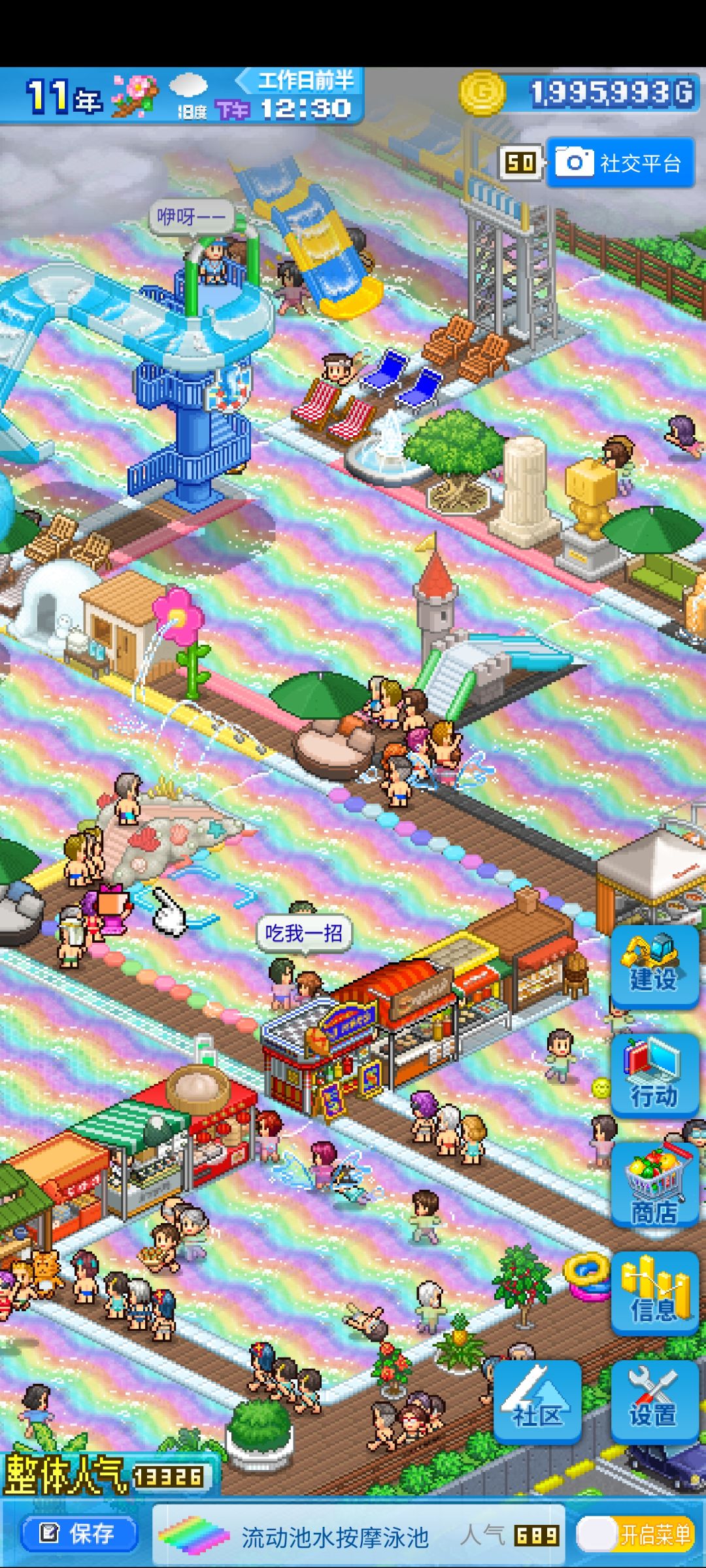 先说说游戏本身不足之处,就是按摩浴池不能平铺,得一个一个点,这个累死我了。 再说小技巧: 游戏实用小技巧: 1.新手困惑于如何做出八色泳池(彩虹色),其实很简单,点击你想要上色的泳池,最好事先清空泳池物品,然后把每种颜色都丢进去就行了,如果不清楚插什么颜色,就看看泳池面板点进颜色里看看缺什么颜色,然后补什么颜色进去,并且保证每种颜色比例1:1,即可形成彩虹色,还有没有人记得最开始的时候,是八个区域