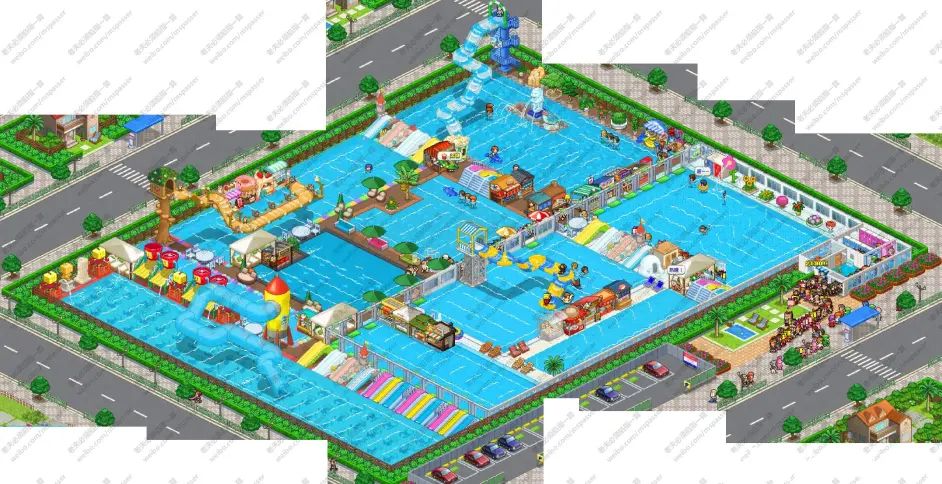 无意间发现的,先说明注意事项,主泳池反复添加道具染色会导致赞清零,强行删除已经添加的颜色道具也会清零,下面说一下泳池赞不消失的添加方法,主泳池不动,如图所示旁边空一格单独建立一个泳池然后添加道具,完成后连通到主泳池,主泳池会同步道具效果,然后拆掉独立的那两格就行了,可以利用这个原理进行多次变色不会清#赞,主水池在计算道具使用一年后会变回无色,参加比赛前在染色,游客要求泳池颜色的可以建几个小泳池做任