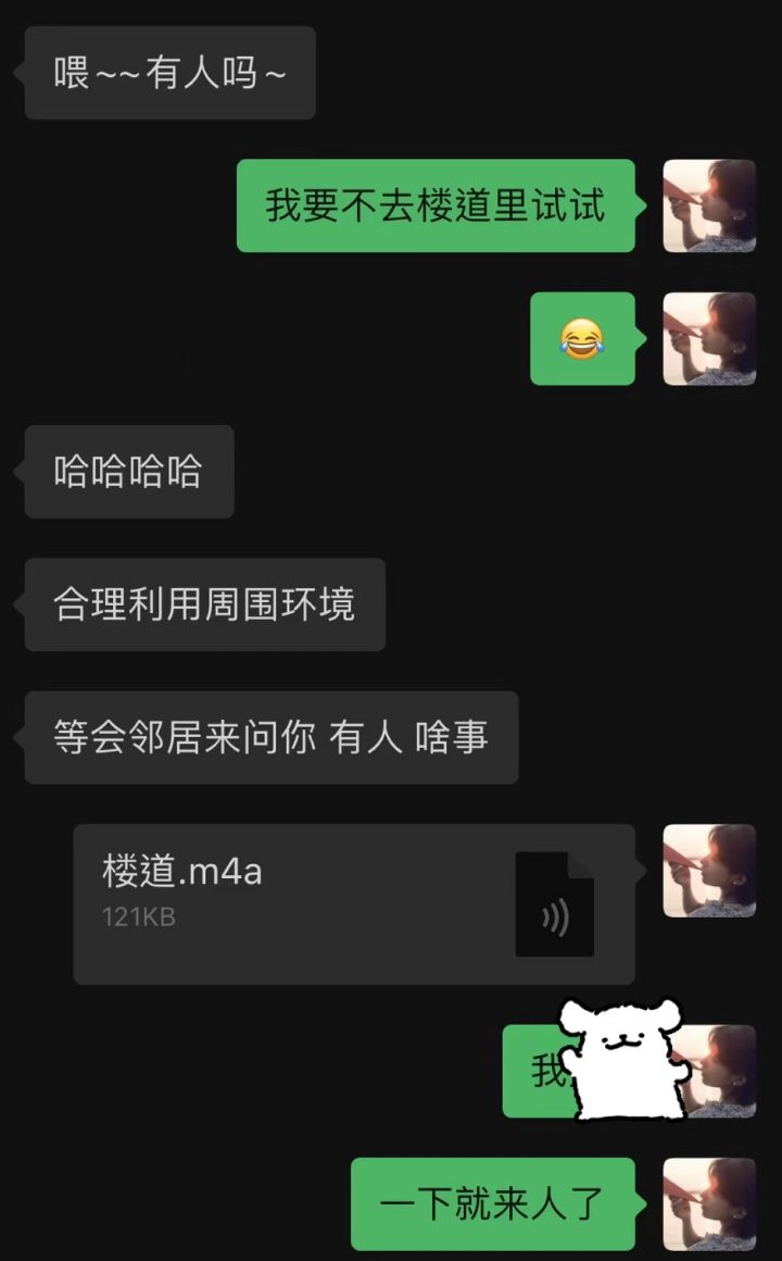 昨天刚把声卡安上声情并茂地配了三小时,我得到了噩耗,策划选了我没用声卡在楼道里配的版本微笑花了5分钟我终于冷静了下来,在拉黑键上停了五秒,想起游戏公司员工们的相亲市场还没开拓,还不能删!(🌚)不过配音的过程还是蛮有趣的,为了扩音效果,先是从厕所,又跑出门,那天下午在楼道:“喂!有人吗?有人能听到我说话吗?”的时候,把楼上楼下的邻居喊出来了,其中还有个歪脖小哥如图4发现了躲在铁门后的