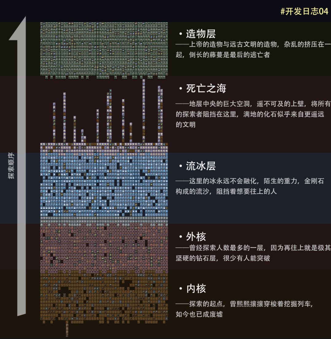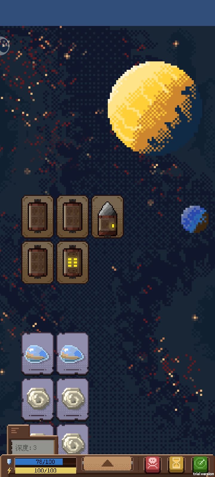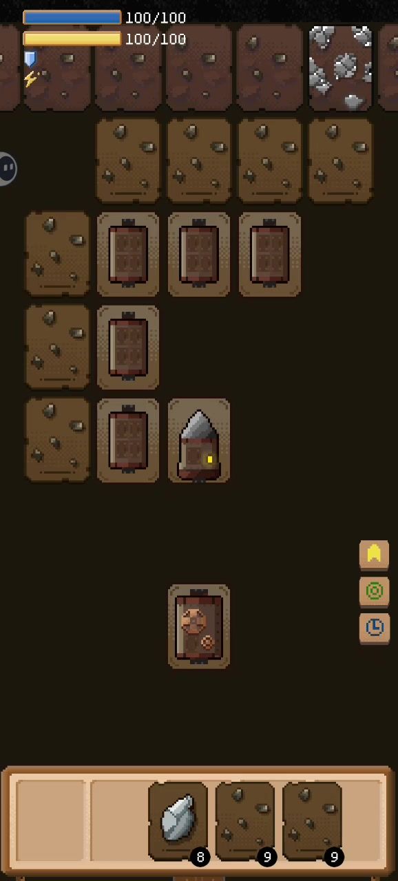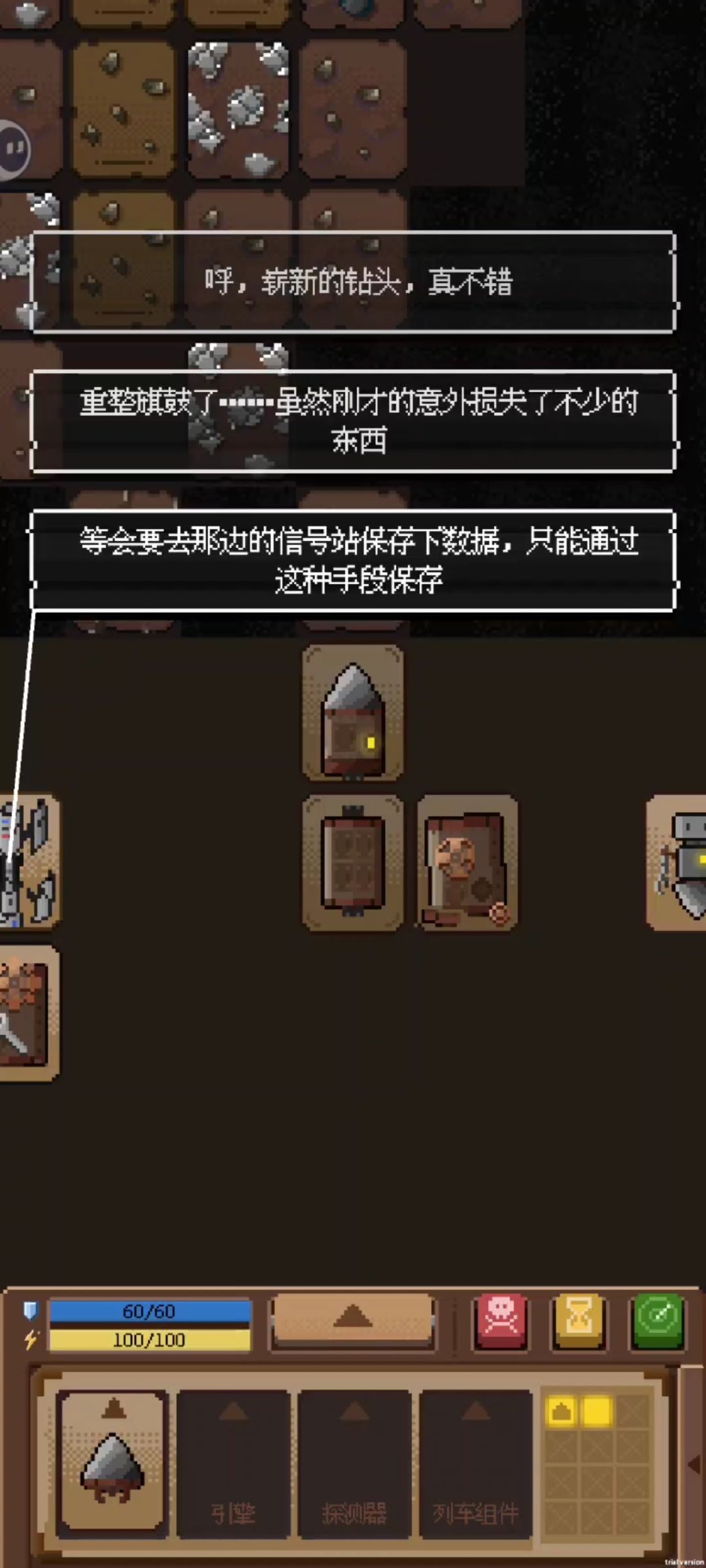 玩法: 首先在车头前方点击、向下挖掘,到达休息点/复活点,有制作站、保存数据点、信号塔、修复塔,回复耐久和能量(简单理解为工具耐久度&体力) 其次手指滑动车厢出现“锁链”,连接上就有车厢作为仓库装东西了,增加车厢上限要在“制作站”制作“引擎” “制造站”里可以制作“车厢”、“探测器”、“引擎”、“钻头”、“装置”、“列车组件”,车头面板4个装备栏:钻头、引擎、探测器、列车组件,地图上有不可移动的仓