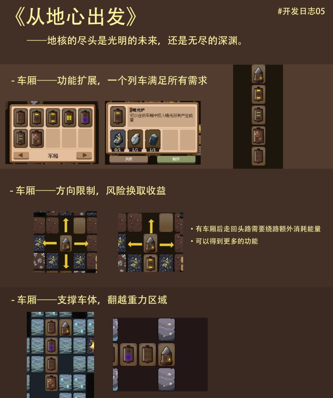 写玩之后我才发现,这游戏简单得不看攻略也很简单。当然有兴趣可以看一看再走。 过完剧情后,找材料把镍合钻和镍Ⅱ型引擎做出来,钻头决定能挖什么,引擎决定能带多少车厢,后期减少挖掘消耗。 因为现版本的矿石还算密集,所以可以不做探测仪。 记得时刻关注自己的电量,留好后路,尽可能少爆车。遇到不好挖的先把左右两边挖开,留好退路。差不多没能量了就直接原路返回地心充能。继续收集材料升级钻头和引擎。 列车组件可以做