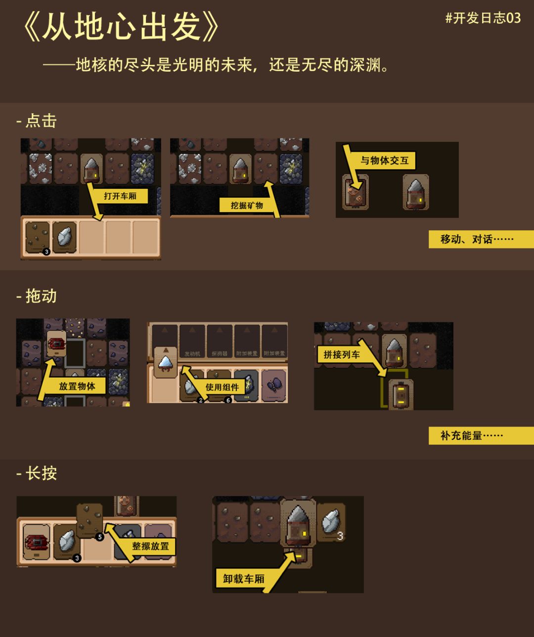 大家好,这里是无远弗届制作组,这一篇介绍一下游戏交互的设计思路。 游戏设计伊始,制作组希望玩家在操作体验上尽可能清爽,并且能将注意力放到探索的乐趣上。于是敲定了游戏全部内容都以一张张方块卡牌的形式表现的思路。 游戏中几乎大部分的内容都是以卡牌的形式展示,无论是岩层、矿石资源、列车与车厢、改造组件,还是暂未表达在当前版本中的奇观、收集物。 在此基础上操作上操作集中于对卡牌的点击、长按与拖