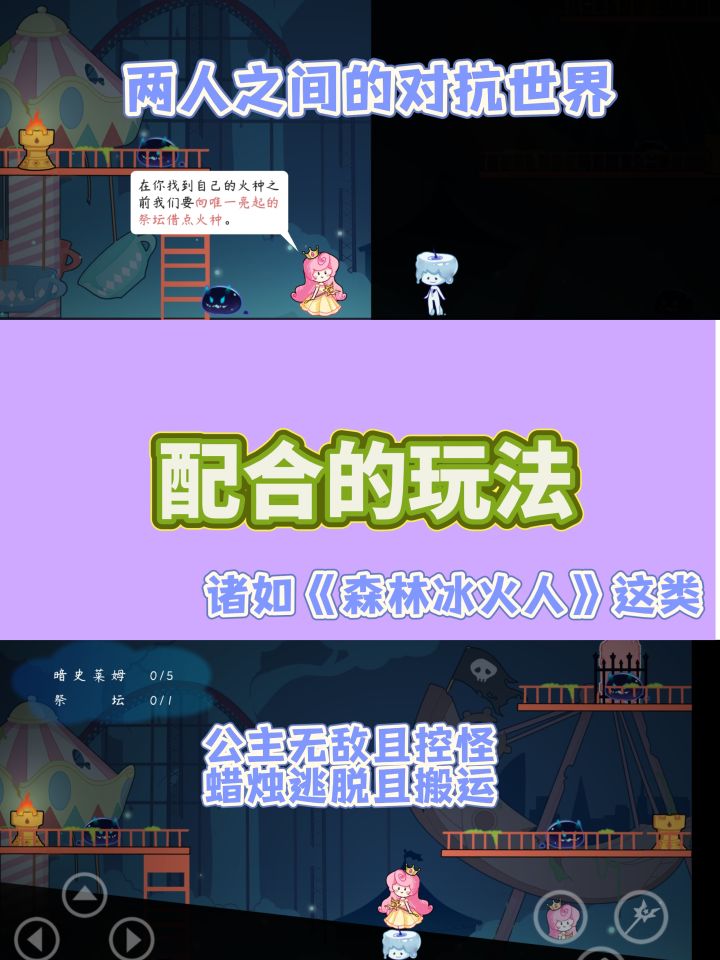 一名角色是身处光明的公主,另一名角色是身处黑暗的蜡烛人,前者无惧史莱姆、后者则是通关的关键。