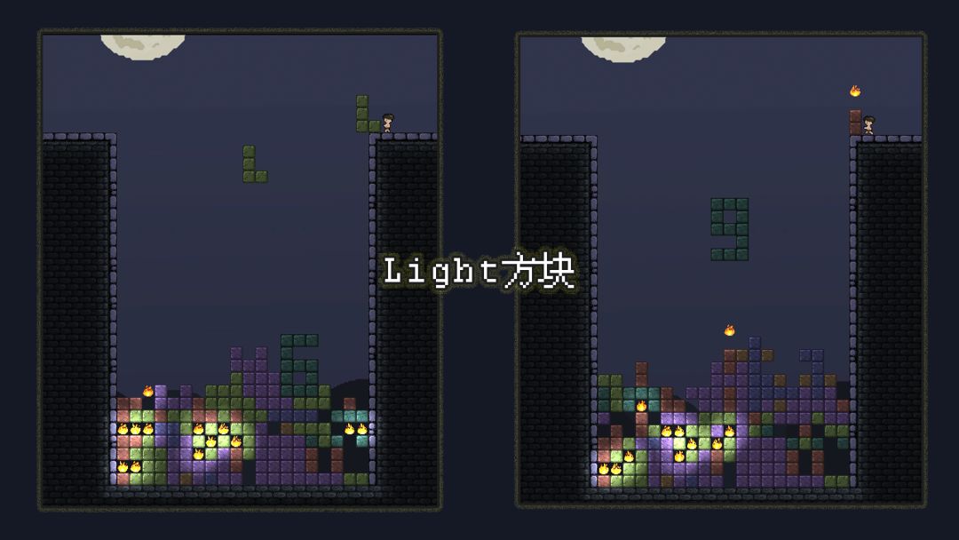 「Light方块」采用 "Light" 的英文字母组成的方块。字母 "i" 上方的点是一团火焰是制胜的关键:火焰可穿透其他方块,火焰落地后会燃烧并取代落地位置的方块,其他方块落在火焰上也可熄灭火焰。字母 "g"的出现带来毁灭性的灾难:其方块数量多,且有闭合的空缺,只能依靠火焰或者消除外围的方块。