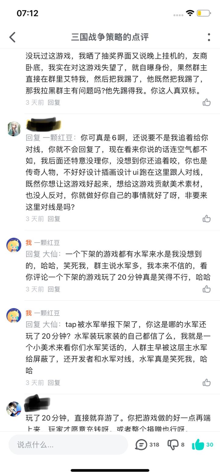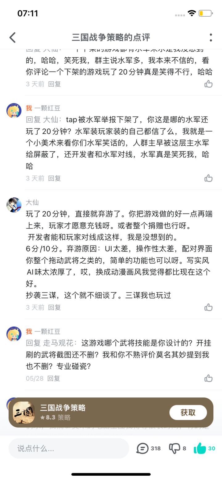 水军水贴超过10万字:这个走马观花,Q群里叫佳期若梦,在群里攻击赞助的大佬,评论攻击群主,所谓攻略恶心论坛写攻略的,评论吹嘘美术大佬、设计武将技能的群友大佬,挑起群友美术大佬群主玩家之间的对立,评论水贴超过10万字。tap早就下架了,还能继续水,被实锤出来后,依然能继续水。。这就是水军,你和水军讲道理,人家的业绩指标只是水而已。。看个笑话就好。。