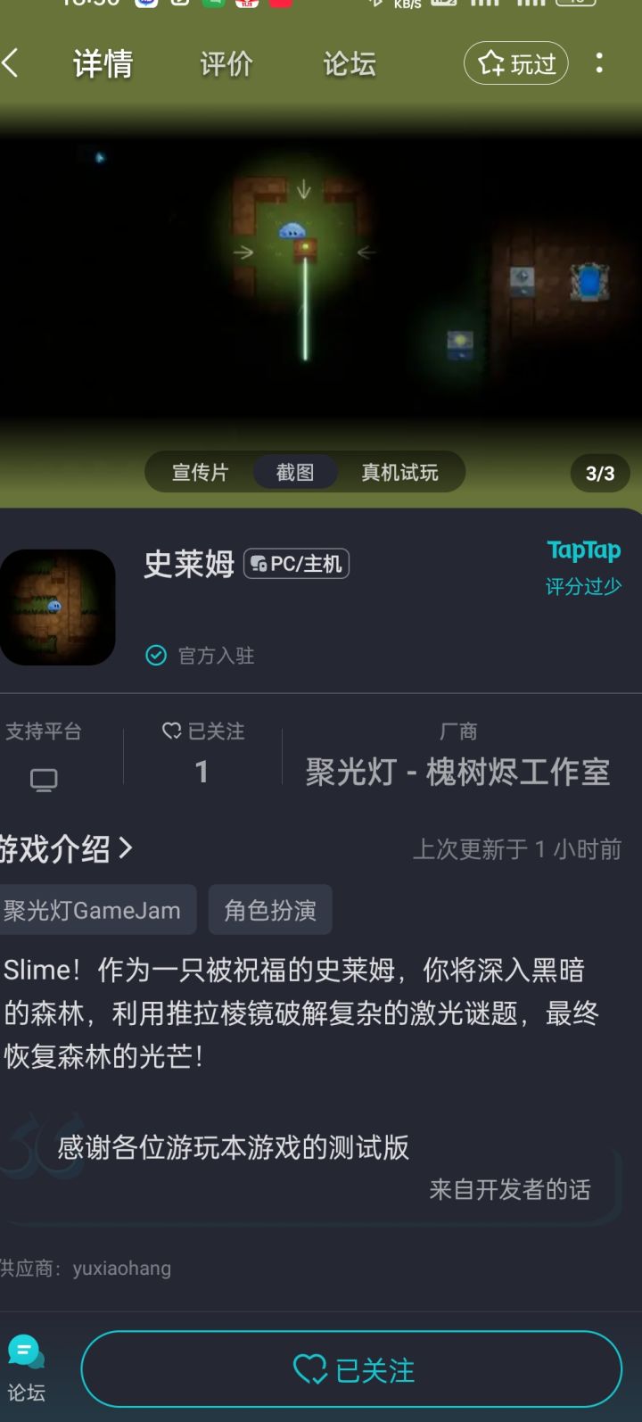在许多年前,森林还曾拥有光芒,可如今,这里只剩下黑暗与废墟;你作为唯一被光明眷顾的生物——一只史莱姆!肩负起了让森林恢复光明的重任。利用好场地中光线,记住黑暗中的道路,不断向前推进,直到抵达与神约定好的地方。 各位玩家们好,今天应该是Sliime与大家见面的第一夜。本周是聚光灯开赛后的第三周,也是最后一周,我们很高兴此时游戏已经被打磨到可以正常游玩,也给了我底气为大家做报告。 虽然我们的背景很