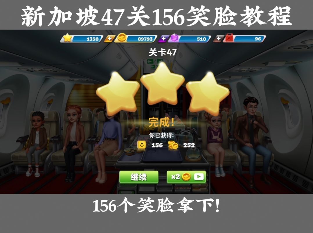 新加坡47关就能有156笑脸!! 🔵新手空姐们,或许还不知道笑脸有什么用。笑脸就是进入游戏底下那一排中黄色的图标 🔹350笑脸即可兑换为一个钻石 🔹而我们在进行普通关卡、超难关卡、金币赛关卡、锦标赛关卡中都会获得笑脸 🔵这个笑脸是怎么出现的呢 🔹1.最少时间送餐可得1笑脸值 🔹2.最少时间收餐盘可得1笑脸值 🔹3.通过送机场里面的枕头眼罩即可的笑脸值 ①每个机场送的东西是不一样的,只需要记住在升