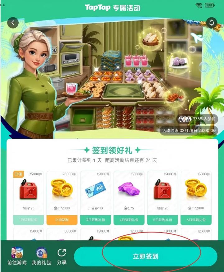 1.点击活动,进入签到页面2.领取流程如图常见问题与注意事项:1.如在活动页面无法查看“”我的奖品“”,建议重新下载taptap或联系taptap平台客服解决。如仍无法解决,可在本帖留言,记得带游戏ID。2.邮件发送失败:检查taptap账号和游戏正在登陆账号是否一致3.邮件有效期为七天,记得及时领取奖励哦