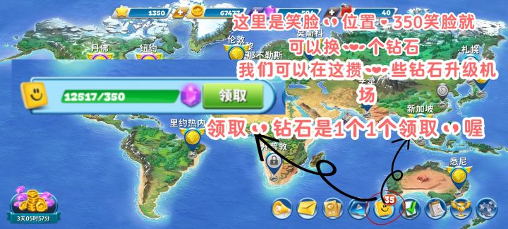 新加坡47关就能有156笑脸!! 🔵新手空姐们,或许还不知道笑脸有什么用。笑脸就是进入游戏底下那一排中黄色的图标 🔹350笑脸即可兑换为一个钻石 🔹而我们在进行普通关卡、超难关卡、金币赛关卡、锦标赛关卡中都会获得笑脸 🔵这个笑脸是怎么出现的呢 🔹1.最少时间送餐可得1笑脸值 🔹2.最少时间收餐盘可得1笑脸值 🔹3.通过送机场里面的枕头眼罩即可的笑脸值 ①每个机场送的东西是不一样的,只需要记住在升