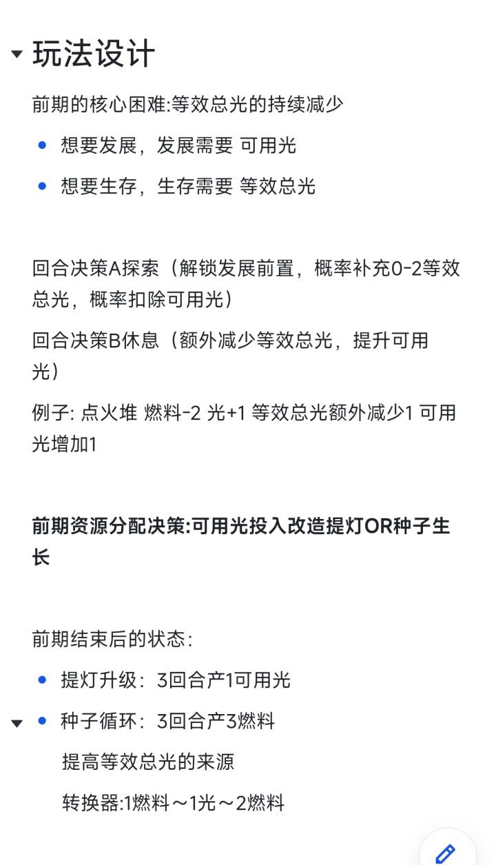 作为设计者和开发者刚在手机上自己通关了一遍 回到正题:这篇是对设计的总结 我最初的想法其实很简单,因为时间少选了实现最简单不依赖美术资源的经济机制游戏但是随着开发进行,纸面上的想法逐渐变为可以游完的原型,我就发现并非那么简单如果体验过游戏的话,应该能发现构成游戏中资源【引擎】的两大核心元素【提灯】和【种子】没错,最初的想法很简单,【提灯】将燃料转变为光,【种子】将光转化为燃料,通过【转