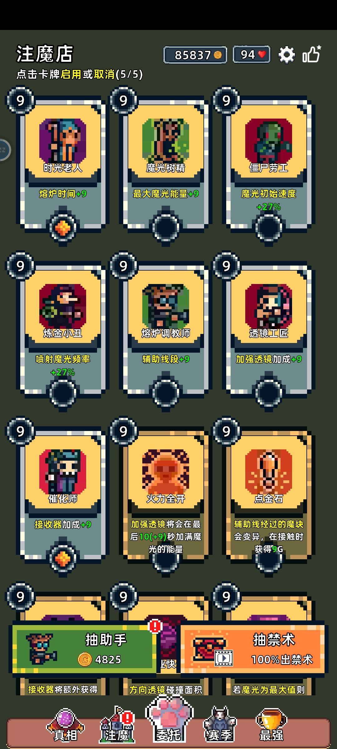 不说这么多,一图胜过千言万语 其中,使用G来抽的卡,就是助手卡。。我先来介绍一下加成和公式: 若你现在卡牌等级为Lv。 [表情_加油]时光老人:可以加+Lv秒; [表情_加油]魔光树精:最大魔光值+Lv点,结合熔炉升级+分裂流极其强大! [表情_加油]僵尸劳工:魔光初始速度+3%*Lv,注意哦!速度并不能增加产量,但是对聚变裂变却很有效; [表情_加油]炼金小丑:喷射频率+3%*Lv。对频率才是真
