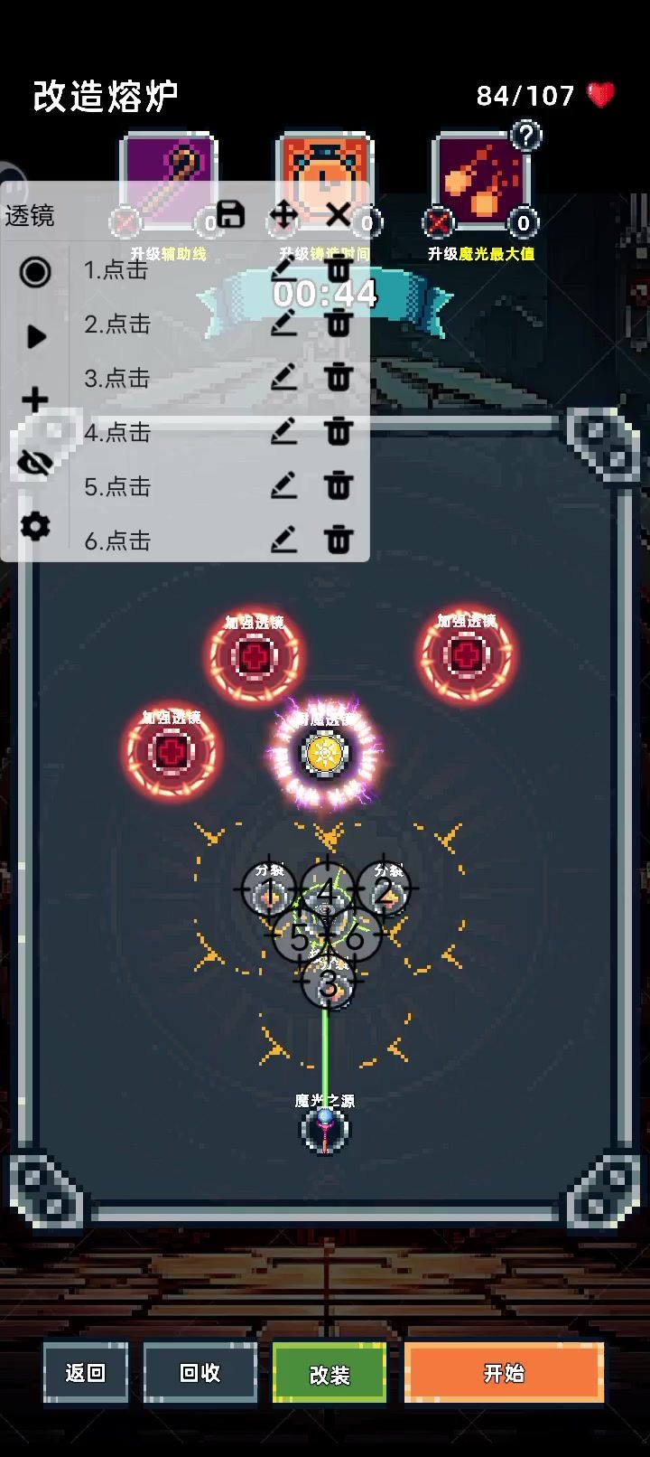 注魔选择:时光老人,魔光树精,透镜工匠,催化师,马太效应。选择圣女关卡,布局如图2,剩下的爱心全部选升级铸造时间。