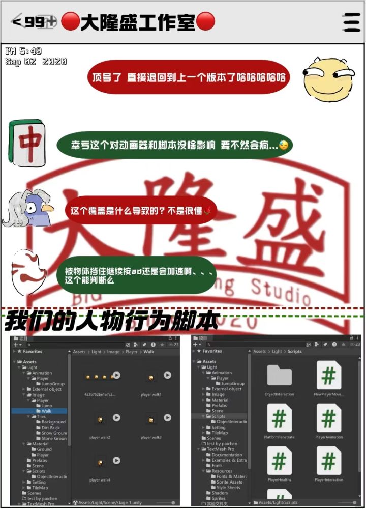 大家好!这里是🔴大隆盛工作室🔴开发第六天 看看我们的程序组都做了些什么吧~ 🆘状况百出 问题层现 ?💪但是我们大隆盛工作室的成员怎么会怕困难!经过程序组的努力~我们的人物行为脚本终于有了一定的进展……我们的游戏研发道路在每一位成员的努力下正在逐渐明 晰,每一次的思考与讨论也都在为我们的游戏添砖加瓦 听说你想知道其他小组的工作进度? 那就请继续关注我们吧🤗 且听下回分解#独立游戏#单机游戏