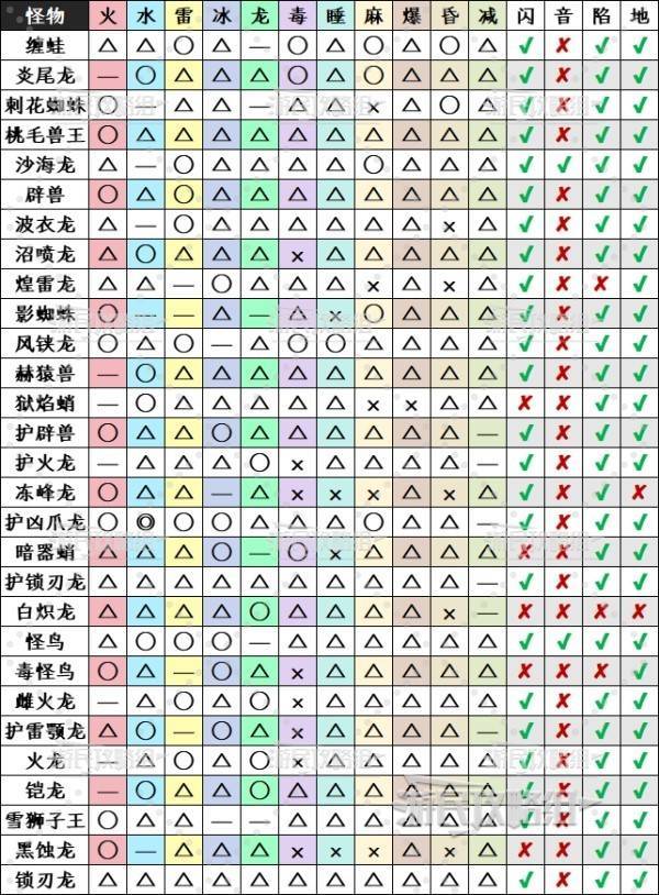 注释 【◎】非常有效;【◯】有效;【△】效果一般;【×】不太有效;【—】无效 【昏】昏厥;【减】减气;【闪】闪光弹;【音】音爆弹;【陷】麻痹陷阱;【地】落穴陷阱 【✔】有效;【✘】无效