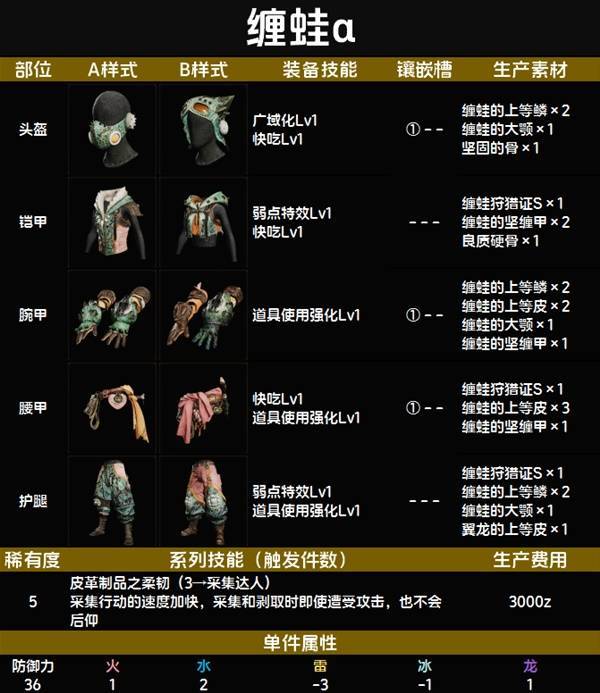 缠蛙α套装图鉴 缠蛙α套装技能与制作材料一览