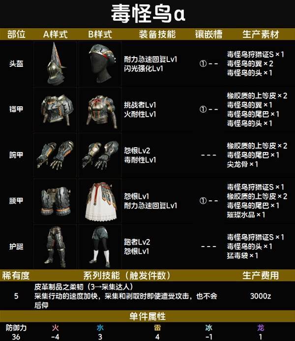 毒怪鸟α套装图鉴 毒怪鸟α套装技能与制作材料一览