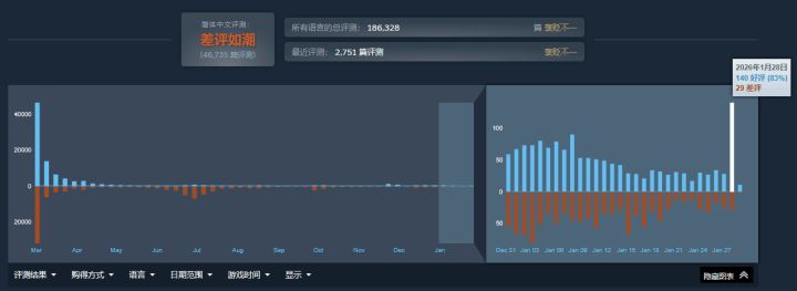 卡普空于1月28日针对《怪物猎人:荒野》PC版推出专用优化补丁Ver.1.040.03.01,补丁上线后,游戏Steam评价迅速回暖,据Steam数据显示,更新当日游戏共收到169份玩家评价,其中140份为好评,仅29份为差评,好评率高达83%本次补丁重点优化PC版性能表现,修复了玩家长期吐槽的大本营、大集会所处理负荷过高的问题,同时精简了游戏整体容量,进一步提升游玩体验。#主机单机 #怪物猎