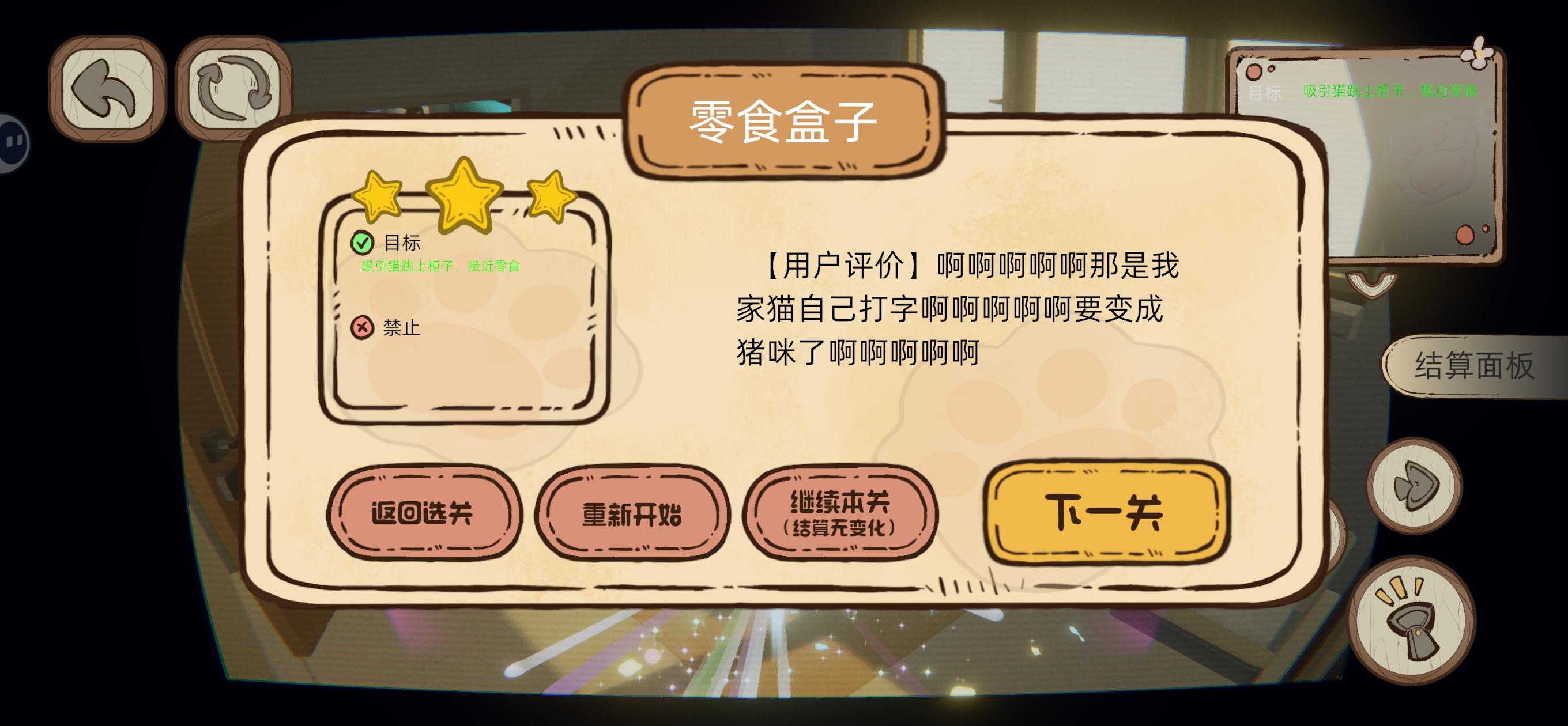 🎮可玩性:我由于没有养过猫,其实不是很清楚这种设计与真实情况到底存在多少差异和准确程度,只从游戏的角度去考量整个玩法对于爱猫的玩家吸引力会更大一点,因为一切关卡设计都是围绕猫来展开,而不是迷题设计。