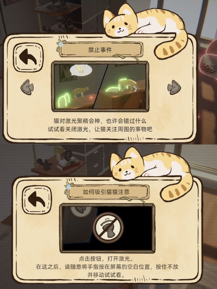 老板喵!老板我们的案子定了喵!老板我们做用激光笔逗猫喵!每次更新论坛的开发日志,我们会以“游戏新增了什么内容”+“我们在此期间做了什么”的双模块,带给老板台前幕后的双重体验喵!设计与开发是一个漫长的过程,比起挤牙膏式发布内容,我们更想按照阶段进行更新喵!向老板保证次次有内容,到处有猫猫喵!一、能玩什么你能拒绝用激光笔逗猫吗?反正我们不能,所以我们做了用激光笔逗猫的、有些不一样的解谜游戏。*