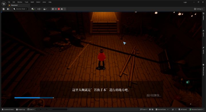 D-DAY 报告,是的,在最后还在完善场景搭建。在地编完成了四个关卡的基本搭建后,我们开始了添加机制的工作。因为要用到光线反射的机制,以及我们将手电筒作为了玩家的主要资源和机制,所以游戏中的场景都较为昏暗,所以光源的运用就会显得格外重要(十分麻烦)0.0但是在ddl的“激励”下我们组员们还是赶在结束前完成了任务最后完成了旁白的植入以及一些调查物品的叙事,基本游戏机制和流程到这里就大致完成了