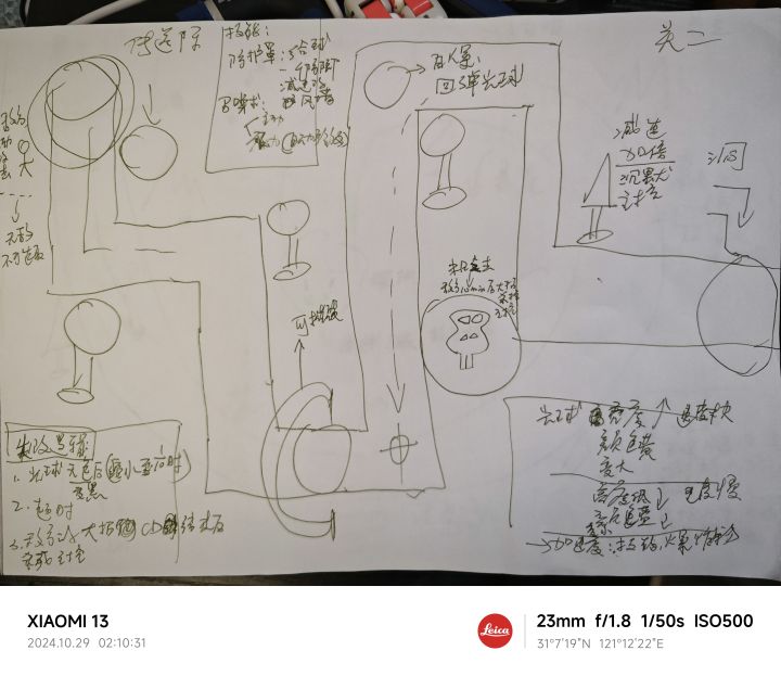在第一关设计结束后,我用了将近三天的时间开始构思后面的地图,世界观以及学习如何实现游戏的主要玩法。这个游戏全部的核心都是围绕一只光球,因此和教程中的塔防逻辑完全不同,所有的单位都需要围绕这个光球进行运作。比如技能需要自动向光球发射等等。在有一天晚上我终于把四关关卡的地图都画完了。可以参考图中的手稿。这也算是相当灵魂画手了。开发过程中进入心流的感觉很棒,可以让我一时间感受不到时间的流逝。虽然会