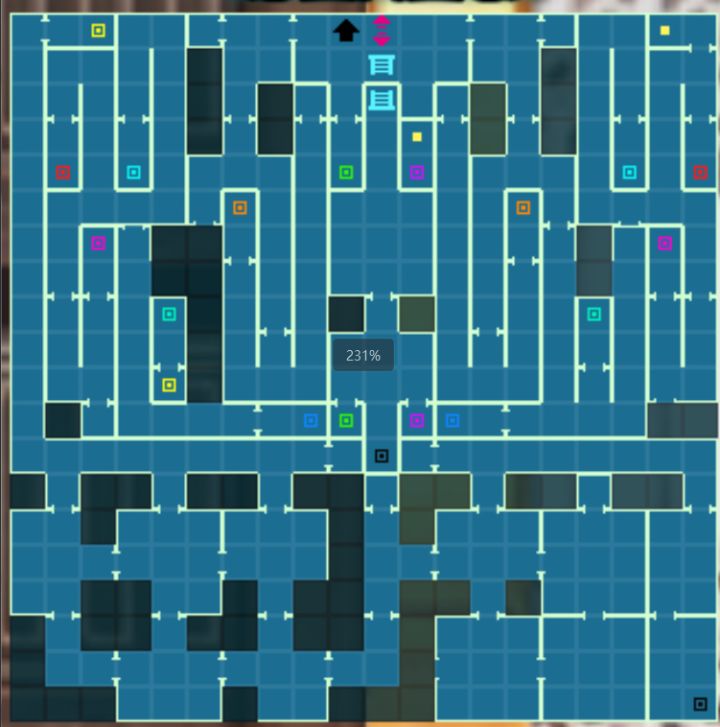 最初的迷宫设计来源自一个魔塔类解密游戏的设计。根据这个平面设计制作了最初的迷宫。但经过测试得到几个问题:1、过多的走廊和拐角导致迷宫在3D的视角中极易迷失方向,我们虽然主要的挑战是迷宫,但也不能让玩家毫无新鲜感,甚至没有正反馈直接放弃游玩。2、缺少兴趣点。3、不利于玩家与怪物进行周旋,缺少一些迂回的路线。4、开阔的房间较少,不利于强调这是后室中的废弃办公室主题。5、魔塔类游戏有很多传送点,但我们不