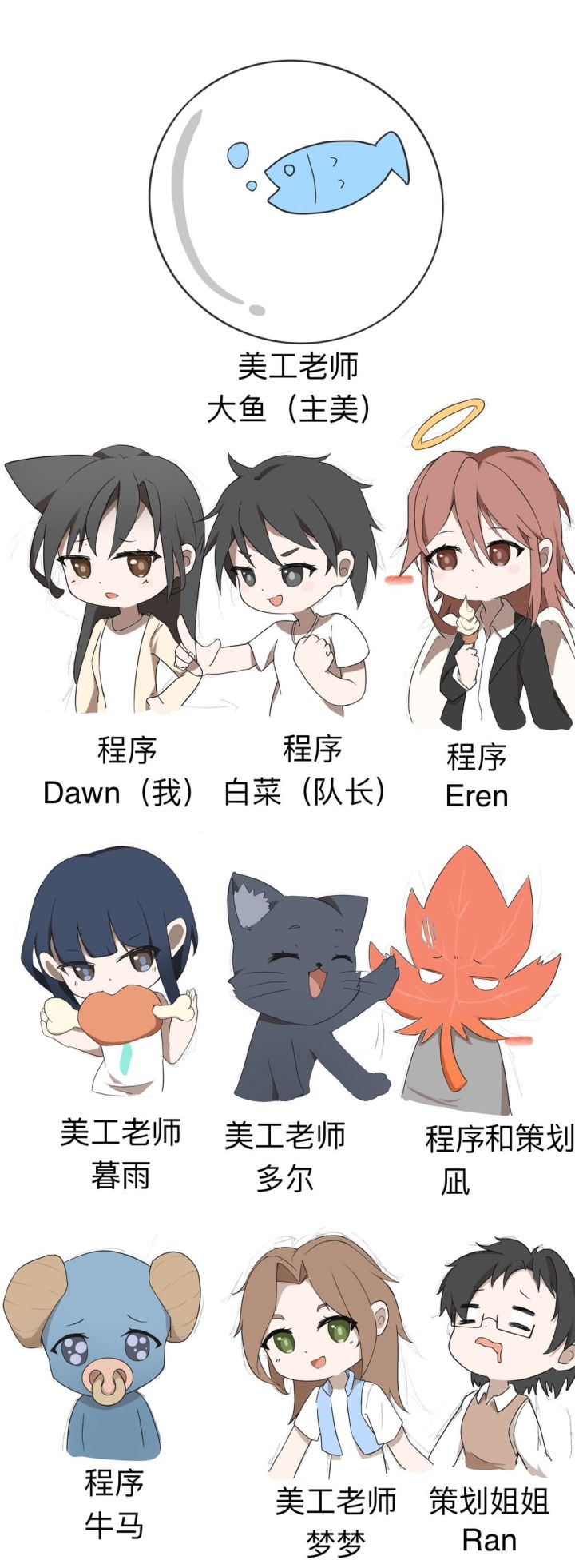 久违啦~友友们今天来发一期团队介绍文,聚光灯-扬帆启航工作室由十位游戏爱好者们组成,分别是两位策划老师,四位美术老师,四位程序老师~我们的团队介绍策划老师(Ran,凪)策划大咖们负责构思游戏的奇妙世界,设计引人入胜的剧情和玩法,让玩家在我们的游戏中尽情冒险!美术老师(大鱼,梦梦,暮雨,多尔)美术老师们用他们的画笔和创意,打造出五彩斑斓的角色和美丽的场景,让游戏充满了视觉盛宴!程序老师