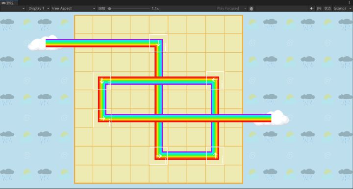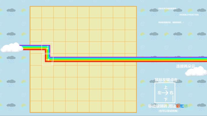 【彩虹桥】整体开发流程已基本完成,游戏已经可以畅通玩耍。目前text与ui在窗口进行缩放以及使用低分辨率显示模式开始游戏时会出现错位。在这里具体介绍一下我们的游戏玩法:鼠标左键点击我们的玻璃块的上下左右四个部分,可以分别推动方块分别往上下左右四个方向移动。同时,我们的程序还很有创意的增加了拖拽的操作功能,只不过目前不是相当完善,可能会失效,推荐使用点击。鼠标右键可以发射彩虹。彩虹从屏幕左边的