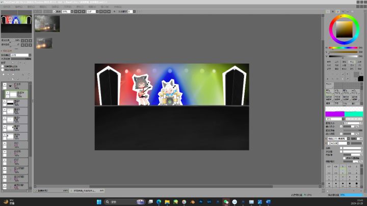 #聚光灯gamejam开发者日志 #TapTap聚光灯独立游戏 2024年10月26日注定是一个不眠的夜晚。游戏大致已经构思好了,而这么搭建场景是个大问题。最初的思路是用聚光灯把对应颜色的灯正面打在人物图层上,但考虑到花花绿绿的灯打在人物上观感不是很好,便将思路更改为从任务背面打光。如果想营造出舞台炫酷灯光的感觉,只有三盏灯肯定是不够的,还要加几盏氛围灯,人物的正面也需要几盏灯,不然逆