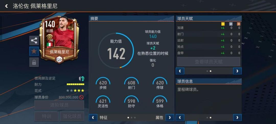 上期我们为大家带来了前腰巨星穆西亚拉的介绍,相信大家已经迫不及待展开任务获得了,本期将继续来讲解另一位球员佩莱格里尼。 洛伦佐·佩莱格里尼,出生于意大利罗马,意大利职业足球运动员,司职中场,效力于意大利足球甲级联赛罗马足球俱乐部。这几年在罗马不断成长之后,如今佩莱格里尼也已经成为了一名备受瞩目的攻击型中场球员。那就让我们来看一下里程碑球员佩莱格里尼的表现吧。 数据方面,佩莱格里尼的基础能力值为14
