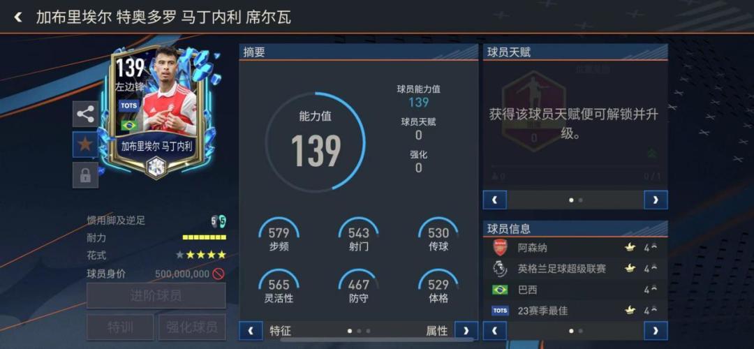 在当今足球世界,边路是球队重要的进攻区域,这就对边锋球员有着更加高的要求,既要有速度、身体,还需要有广阔的视野和出色的传球能力,今天,就让小编在正在进行的TOTS活动中,给玩家们推荐一位强力左边锋——马丁内利。 加布里埃尔·马丁内利,2001年6月18日出生于巴西瓜鲁柳斯,巴西足球运动员,场上司职左边锋,现效力于英格兰超级联赛的阿森纳足球俱乐部。本赛季马丁内利在英超联赛出场36次,打进15球助攻5