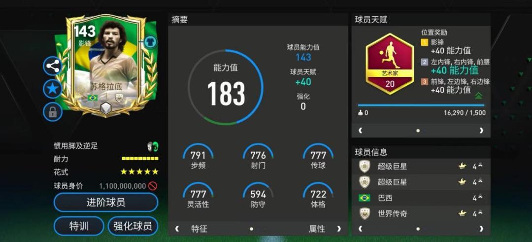 影锋:苏格拉底 桑巴国度从来都不缺少足球天才,“文武双全”的苏格拉底就是这个足球王国历史上最伟大的球星之一。在就读大学期间,苏格拉底不仅球技惊人,还获得了获得医学博士学位,而在国家队层面,他也多次以队长身份带队出征。 美洲杯传奇苏格拉底配备了艺术家天赋,对他的加速、射门等数据都有提升。花式方面,五星花式星级结合马赛回旋让他的中前场持球进攻更具威胁。实战中,苏格拉底的身材高大,具备极强的进攻适应能力
